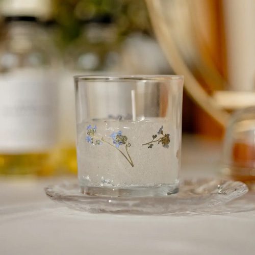 Summer Breeze is a hand-poured candle designed to resemble iced water — soft translucent in a clear glass jar. What makes it truly special? A real dried flower suspended inside the wax, turning every burn into a quiet moment of magic.